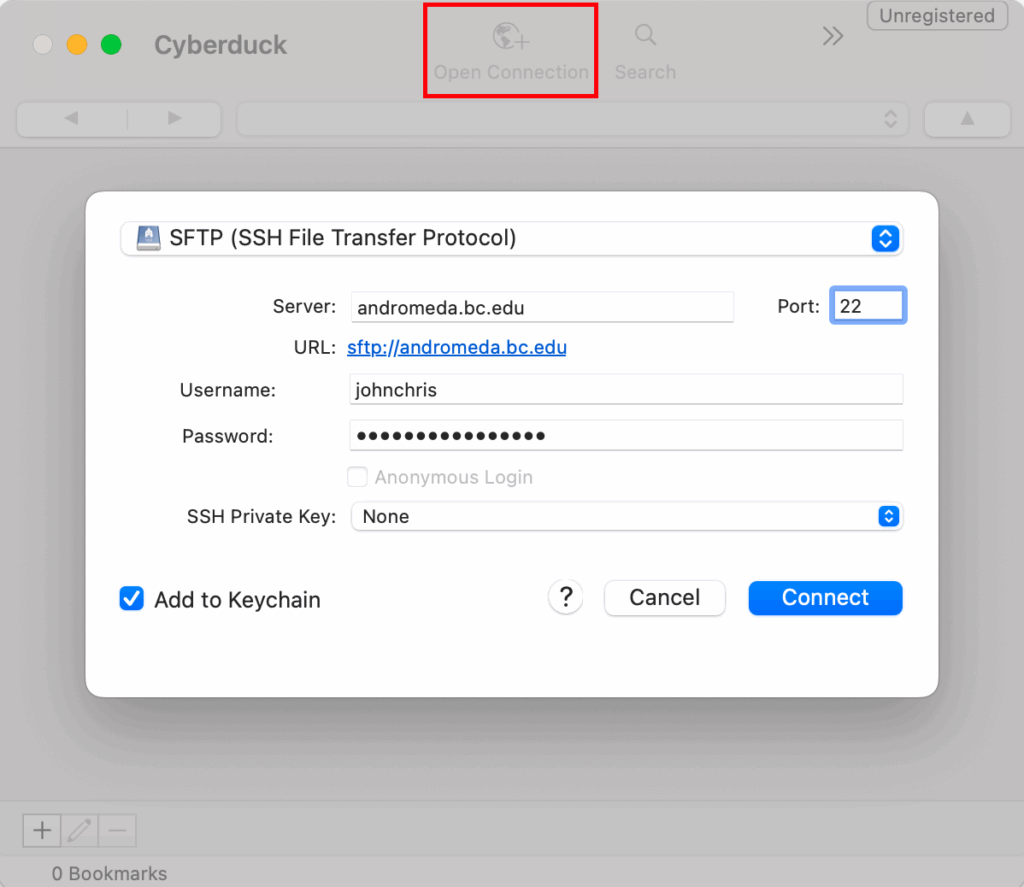 - Start Cyberduck, click Open Connection on the top left corner