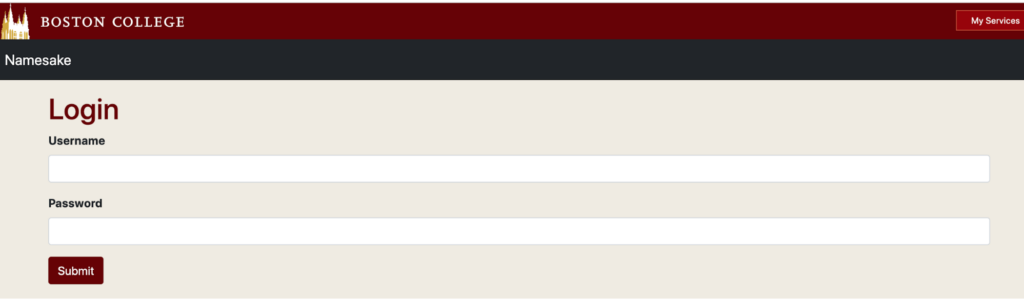 - Log into the following Namesake server with the user’s BC username and Agora password: https://namesake.bc.edu/namesake/login