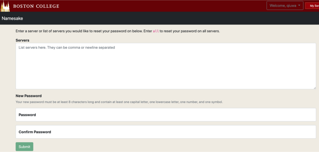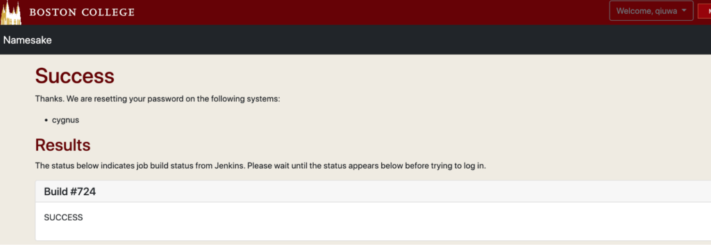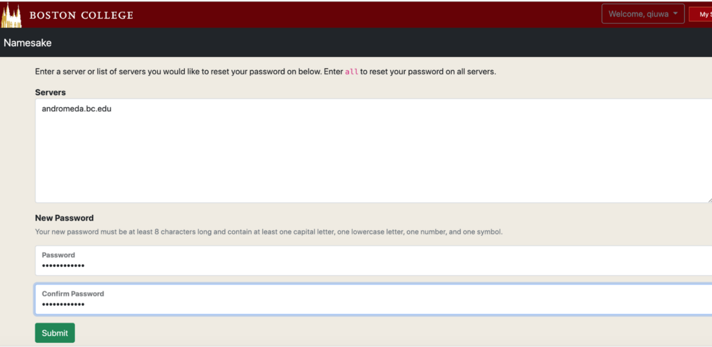 Users on the Boston College Linux cluster may set their password using namesake for initial password establishment as well as any subsequent resets.